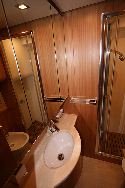 floor dressed in American walnut, travertine marble in bathrooms, teak shower floor, teak steps to fly bridge and descent to stern