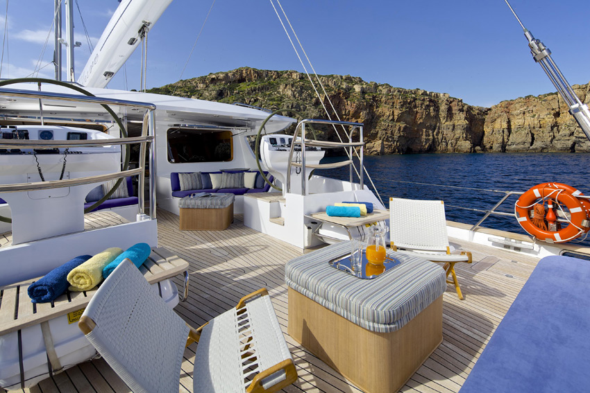 Communications include 3G Internet connection. Audio Visual Equipment and Deck Facilities include Sat TV, DVD, CD stereo surround system in Salon, Master cabin and Guest cabins. |