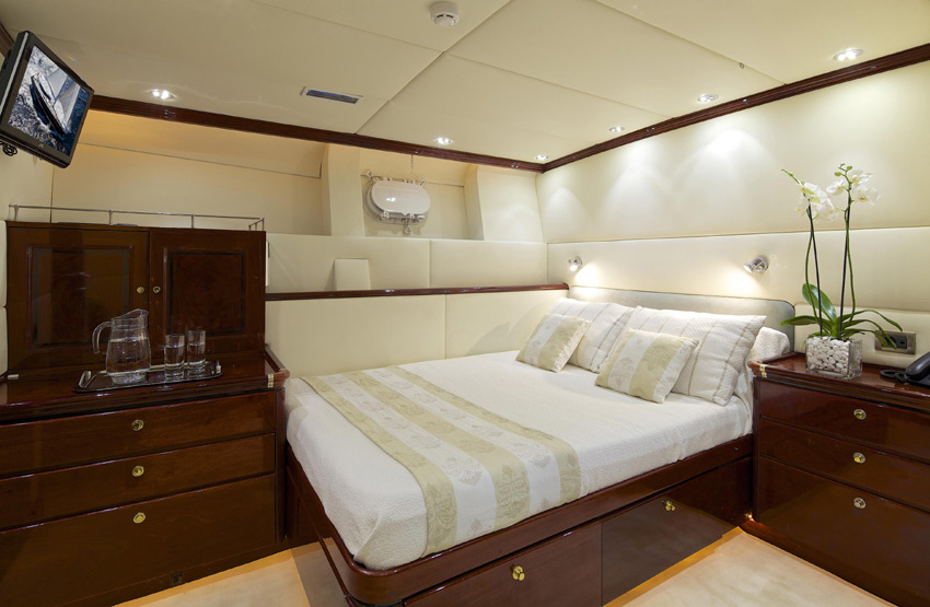 Luxury crewed charter yacht ALLURE offers 4 spacious en-suite cabins with accommodation for up to 10 guests. The master stateroom offers a queen size bed, full beam layout and love seat. Three guest cabins offer double beds each, one with an additional twin bed, another will a Pullman berth. All 4 cabins are fully air conditioned, offer private marble en-suite facilities, and boast a serene relaxing ambiance. |